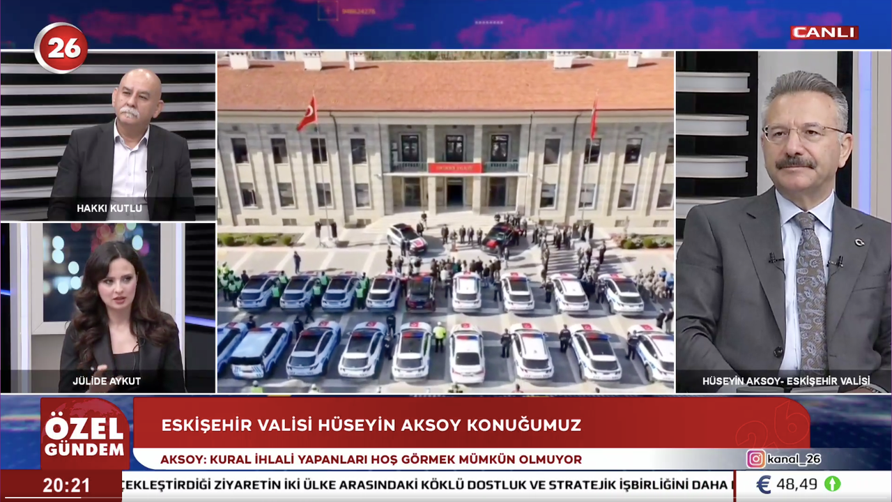Eskişehir Valisi Hüseyin Aksoy, 22 Ekim Çarşamba akşamı saat 20.15’te, Jülide Aykut ve Hakkı Kutlu’nun moderatörlüğünde, Kanal 26 ekranlarında canlı yayınlanan “Özel Gündem” programına konuk oldu.