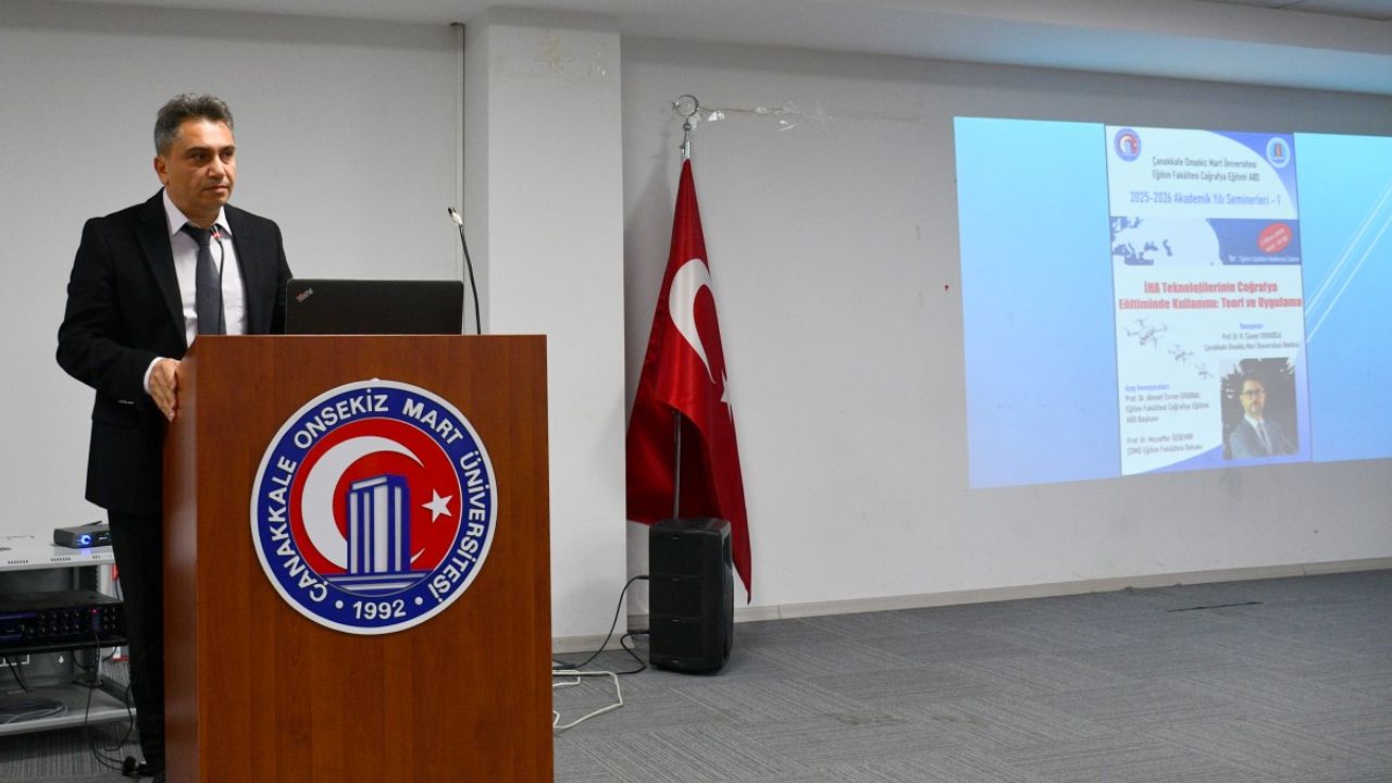 Çanakkale Onsekiz Mart Üniversitesi (ÇOMÜ) Eğitim Fakültesi Coğrafya Eğitimi Anabilim Dalı tarafından düzenlenen “2025-2026 Akademik Yılı Seminerleri – 1” etkinliği kapsamında, “İHA Teknolojilerinin Coğrafya Eğitiminde Kullanımı: Teori ve Uygulama” başlıklı seminer gerçekleştirildi.