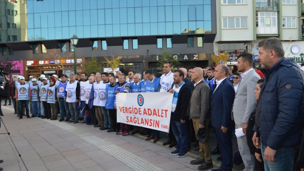Eylemciler adına konuşan Türk İş İl Temsilcisi Orhan Demir, Türkiye’de ücretli çalışanlar üzerinde hem doğrudan gelir ve kazanç üzerinden alınan hem de dolaylı olarak mal ve hizmet üzerinden alınan vergilerin ağır yükünün bulunduğunu söyledi. İşçilerin eline geçen net ücretin vergi kesintileri nedeniyle yılbaşına göre geçen sürede giderek gerilediğini aktaran Demir,‘‘ Ocak ayında net 3 bin 409 TL ücret alan işçi temmuz ayında yüzde 4 oranında zam alsa dahi yıl sonu maaşı 3 bin 060 TL’ye geriliyor. Bu vergi düzeni adil değildir. Hakka ve hukuka uygun değildir. TBMM’ye sunulan vergi düzeninde yeni değişiklikleri içeren yasa teklifi emekçilerin beklentilerini karşılamamakta ve vergi adaletsizliğini ortadan kaldırmamaktadır. Türkiye’de uygulanmakta olan tüm vergi kanunlarında öncelik ‘vergi adaleti’ sağlanması olmalıdır. Türk İş olarak bu adaletsiz vergi düzeninin değiştirilmesini, emekçilerin vergi yükü altında ezilmesine son verilmesini talep ediyoruz’’ ifadelerini kullandı.