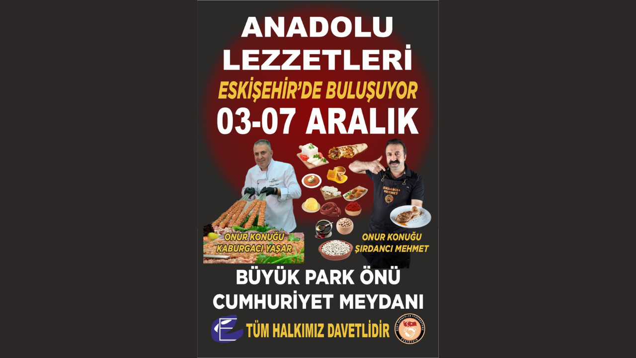 Anadolu Lezzetleri 03 Aralık'ta Eskişehirlilerle buluşuyor. Büyük Park önünde Cumhuriyet Meydanı'nda gerçekleşecek olan etkinlikte birbirinden güzel lezzetler, Eskişehirlilerin beğenisine sunulacak. 03-07 Aralık tarihlerinde gerçekleştirilecek olan etkinliğin onur konukları Kaburgacı Yaşar ve Şırdancı Mehmet olacak. Organizasyon yetkilileri, tüm Eskişehirlileri, birbirinden güzel lezzetleri tatmak için etkinliğe davet etti.