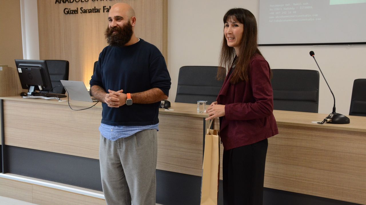 Sunumunda eğitim ve mesleki yolculuğuna değinen İbrahim Yıldızbaş, üniversite döneminden stüdyo sürecine uzanan deneyimlerini paylaştı. Yıldızbaş, “Grafiğe geçmek için bu bölümü seçmiştim, okurken de hiç sevmedim. Askere gittiğimde bu işi sevdiğimi fark ettim ve yapmaya karar verdim. İki yıl hocamın atölyesinde çalıştım ve 2017’de kendi stüdyomu açmaya karar verdim.” dedi.
