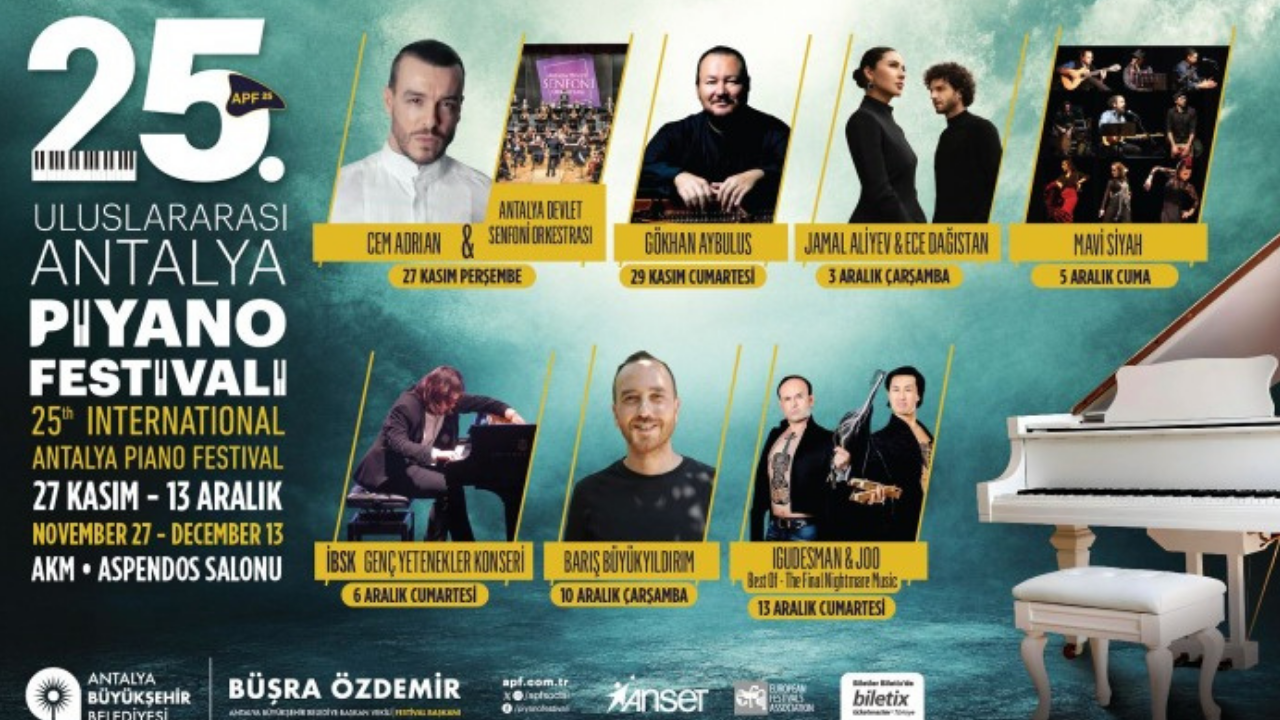 Antalya Büyükşehir Belediyesi’nin ev sahipliğinde düzenlenen Türkiye’nin en önemli sanat etkinliklerinden biri olan Uluslararası Antalya Piyano Festivali, 27 Kasım -13 Aralık 2025 tarihleri arasında gerçekleşecek. Bu yıl 25. kez sanatseverle buluşacak festival, yine dopdolu bir içerikle müzikseverlerle buluşacak. Piyano festivalinin açılışında Türk müziğinin güçlü sesi Cem Adrian, Antalya Devlet Senfoni Orkestrası ile muhteşem bir konsere imza atacak.