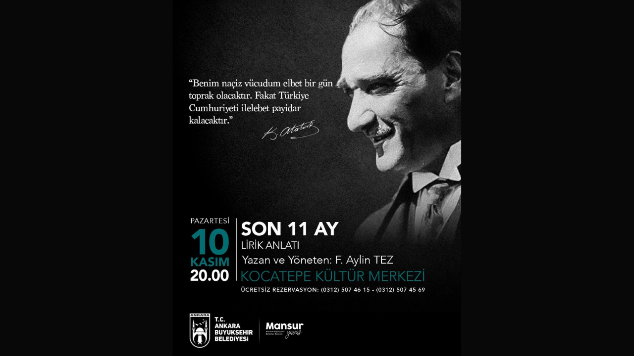 Atatürk’ün hayatını, fikirlerini ve Cumhuriyet’in kuruluş sürecini anlatan program kapsamında; 10 Kasım Pazartesi günü Kocatepe Kültür Merkezi’nde 13.00-17.00 saatleri arasında çocuklara yönelik “Atatürk Temalı Çocuk Atölyeleri” gerçekleştirilecek. Aynı gün saat 20.00’de ise “Son 11 Ay” isimli lirik anlatı sahnelenecek.