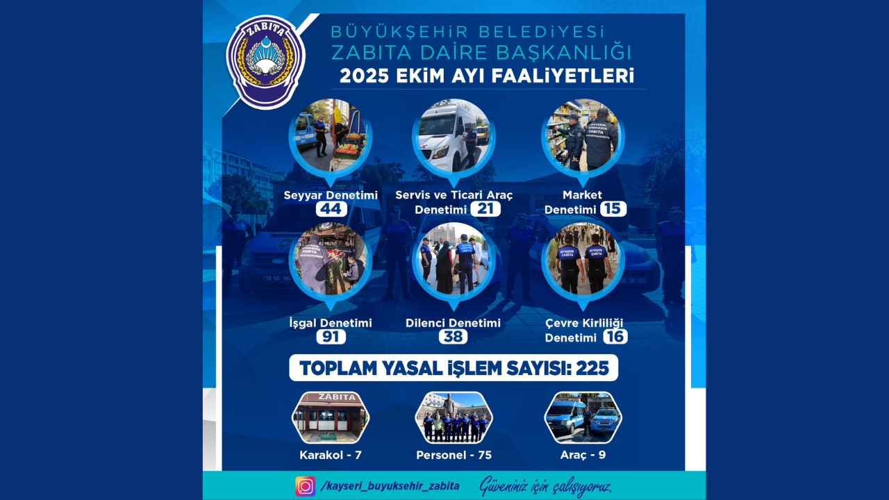 Kayseri Büyükşehir Belediyesi Zabıta Daire Başkanlığı, 2025 yılı Ekim ayında gerçekleştirdiği 225 denetimle şehir genelinde huzur, güvenlik ve düzenin sağlanmasına önemli katkı sundu.
