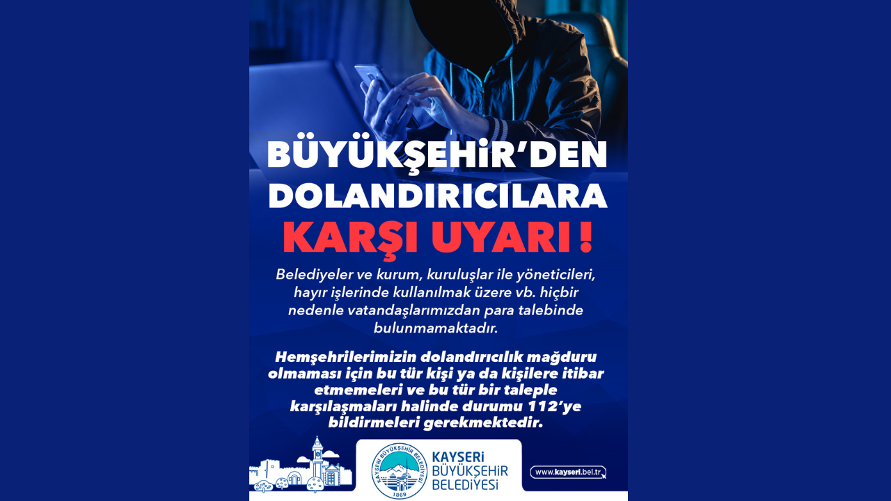 Kayseri Büyükşehir Belediyesi, belediyeler ve kurum, kuruluşlar ile yöneticilerinin ismini anarak, hayır işlerinde kullanılmak üzerinde para talep eden, dolandırıcılık girişiminde bulunan art niyetli kişiler konusunda vatandaşları dikkatli olmaya çağırdı.