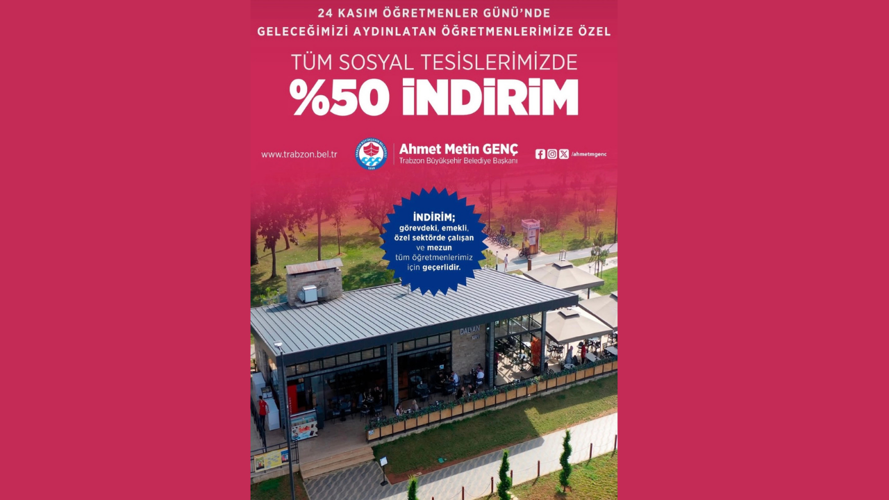 Trabzon Büyükşehir Belediyesi’ne ait tüm sosyal tesislerde, 24 Kasım Öğretmenler Günü dolayısıyla tüm öğretmenlere yüzde 50 indirim uygulanacak.