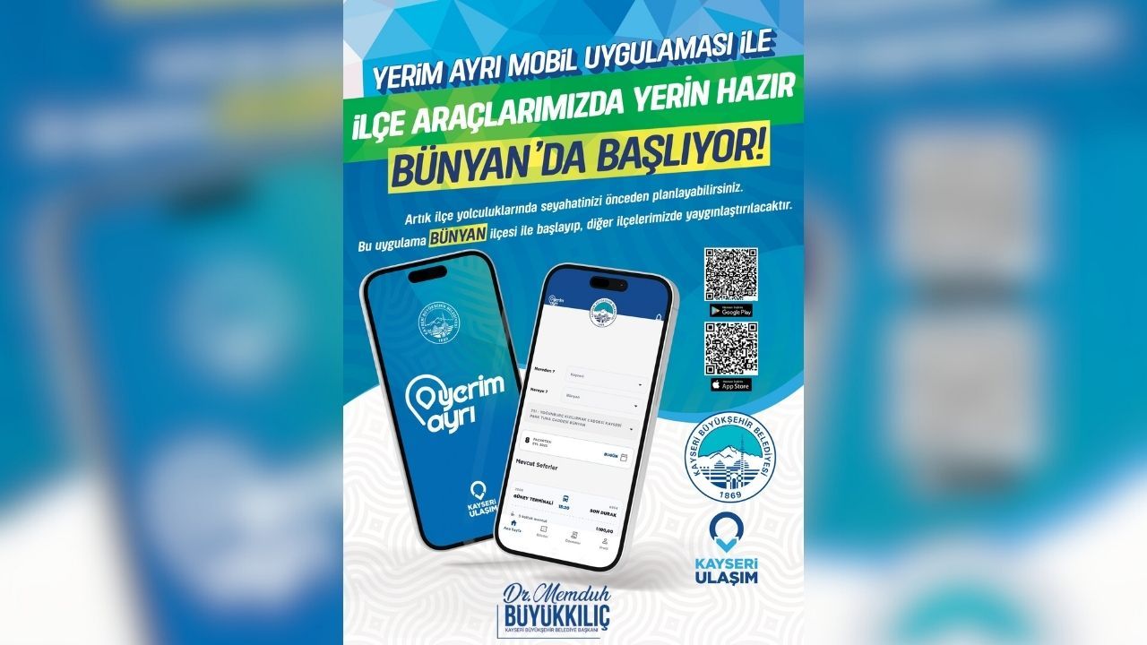 “Kayseri Büyükşehir Belediyesi’nden bir ilk daha. Artık ilçe yolculuklarında seyahatlerinizi önceden planlayabileceksiniz. Kayseri'de Talep Odaklı Ulaşım Uygulaması’nın ilk adımı olacak olan bu projemiz; Kayseri Şehir Merkezi ile İlçeler arasında ulaşım araçlarını kullanan yolcularımız için büyük kolaylık sağlayacak. Kullanıma sunacağımız ‘Yerim Ayrı Mobil Uygulamamız’ ile ilçe seyahatlerinize ait biletlerinizi mobil uygulama üzerinden satın alarak, koltuğunuz yolculuk öncesinde hazır olacak ve kalkış duraklarına gitmenize gerek kalmadan ilgili ilçe hattının güzergâhı üzerindeki tanımlı duraklardan araçlarımıza biniş yapabileceksiniz. Yerim Ayrı Mobil Uygulamamız ilk olarak Bünyan ilçemizde yolcularımızın kullanımına sunulacaktır.”