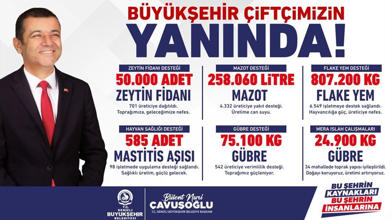 Denizli genelinde 701 üreticiye 50 bin adet zeytin fidanı dağıtılarak, zeytin üretiminin yaygınlaştırılması ve alternatif gelir kaynaklarının artırılması hedeflendi. 4 bin 332 üreticiye toplam 258 bin 60 litre mazot desteği sağlanarak tarımsal üretimin devamlılığına katkı verildi. Hayvancılıkla uğraşan 6 bin 549 işletmeye 807 bin 200 kilogram flake yem desteği ulaştırıldı. Ayrıca 98 işletmede 585 adet mastitis aşısı uygulanarak hayvan sağlığı ve süt verimliliği desteklendi.