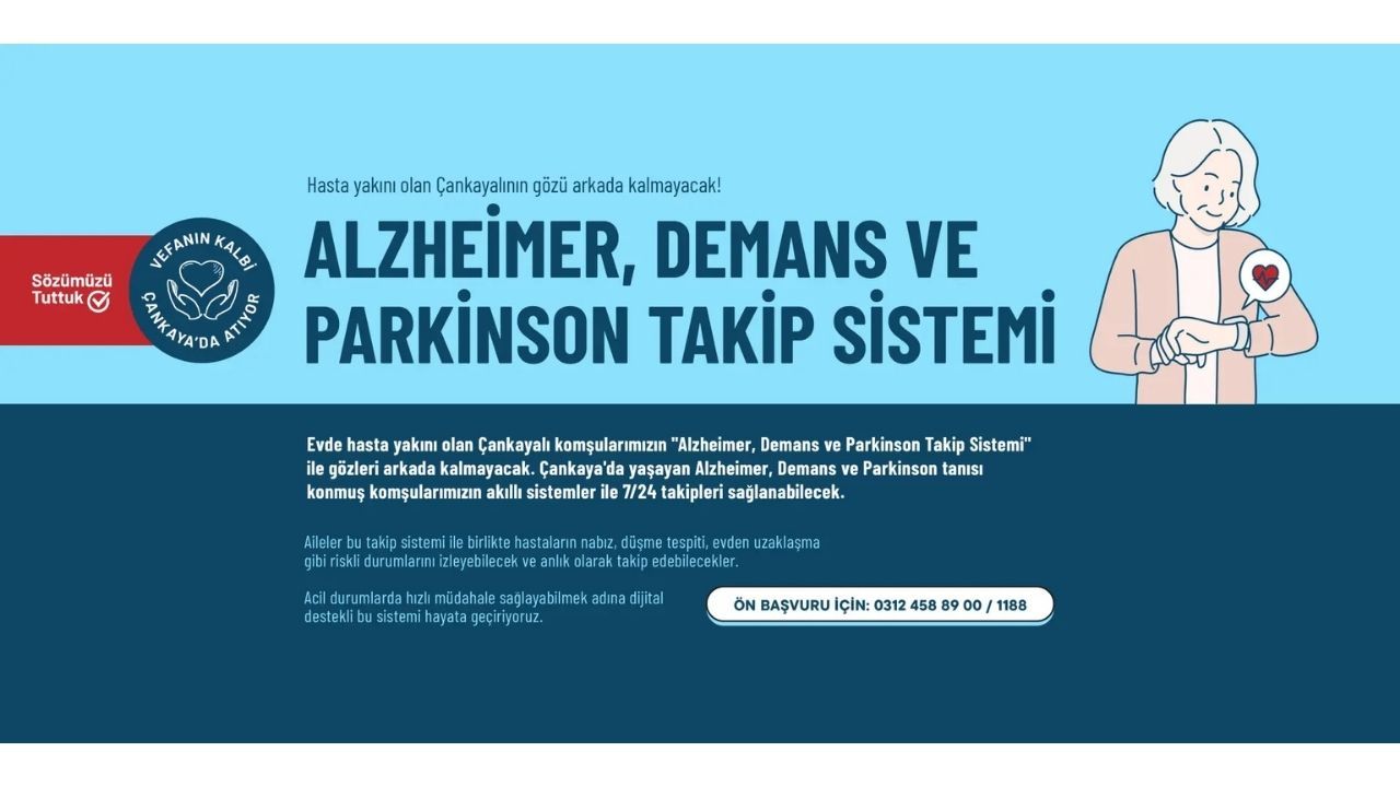 Yeni projeyle, Çankaya'da yaşayan Alzheimer, Demans ve Parkinson tanısı konmuş vatandaşların akıllı sistemlerle 7/24 takipleri sağlanabilecek. Aileler bu takip sistemiyle hastaların nabız, düşme tespiti, evden uzaklaşma gibi riskli durumlarını izleyebilecek ve anlık olarak takip edebilecekler. Acil durumlarda hızlı müdahale sağlayabilmek adına dijital destekli olarak hazırlanan bu sisteme vatandaşlar 0312 458 89 00 / 1188 no'lu telefondan ön başvuru yapabilecekler.