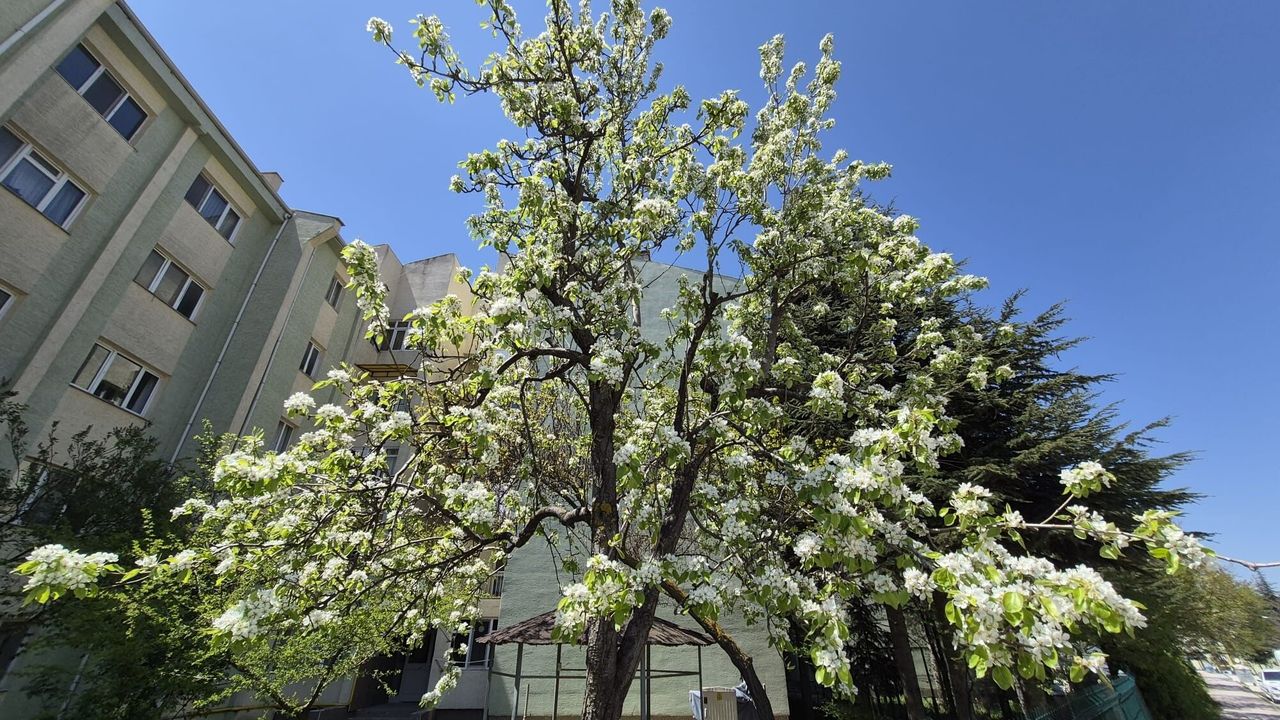 Odunpazarı’nın köklü mahallelerinden biri olan Çankaya’da baharın gelmesiyle meyve ağaçları birer birer çiçeklenmeye başladı. Özellikle bir evin bahçesinde yükselen dev armut ağacı, bu yıl her zamankinden daha coşkulu bir şekilde çiçek açarak mahallede adeta bir odak noktası haline geldi. Dallarını saran yoğun beyaz çiçek dokusu, beton binaların arasında ferahlatıcı bir manzara sunuyor.