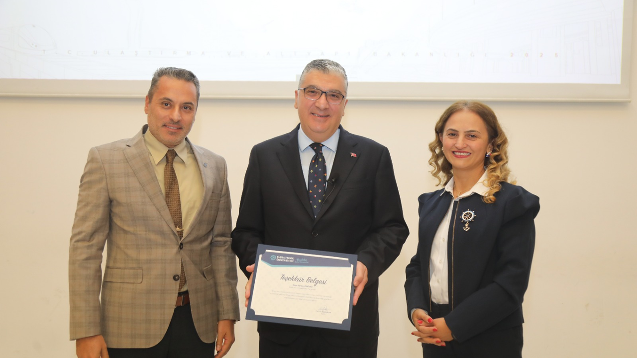 Türkiye’nin uluslararası organizasyonların çoğunda yer aldığını ve başarılarını ispat etmeye devam ettiğini vurgulayan Durmuş Ünüvar, 50 farklı ülke ile imzalanmış 64 denizcilik anlaşmasının olduğunu anlattı. Türk limanlarının yükselişe devam ettiğini kaydeden Ünüvar, dünyanın en iyi 100 limanının 5’inin Türkiye’den olduğunu söyledi. Türkiye’nin 142 bin gemi insanı ile çalıştığını dile getiren Durmuş Ünüvar, çok daha iyilerini mezun olacak Denizcilik Fakültesi öğrencileri ile yapacaklarını kaydetti. Bakan Yardımcısı Ünüvar, mezun olacak öğrencilerin iş hayatında dikkat etmesi gereken hususları da aktararak konuşmasını sonlandırdı. Açılış dersinin ardından Denizcilik Fakültesi Dekanı Prof. Dr. Erinç Dobrucalı ve Denizcilik İşletmeleri Yönetimi Bölüm Başkanı Prof. Dr. Gökçe Çiçek Ceyhun, Ulaştırma ve Altyapı Bakan Yardımcısı Durmuş Ünüvar’a teşekkür belgesi takdim etti. Açılış dersi, toplu fotoğraf çekimi ile son buldu.