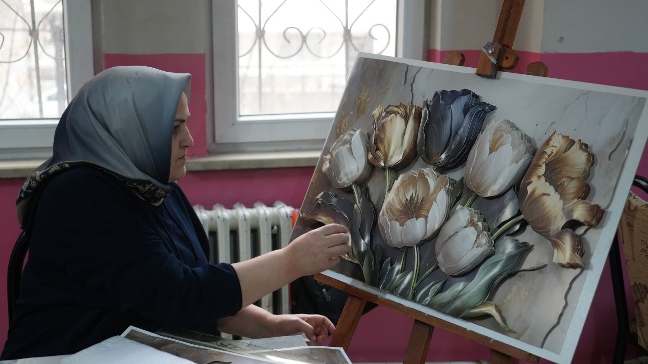 Muş Halk Eğitim Merkezi Müdürlüğü'nce açılan kağıt rölyef kursuna katılan kadınlar, aldıkları eğitimlerle hem meslek öğreniyor hem de ürettikleri ürünlerle aile ekonomisine katkı sağlıyor. Eğitmenler eşliğinde kağıt rölyef tekniğini uygulamalı olarak öğrenen kursiyerler, çeşitli tablolar ve dekoratif ürünler ortaya çıkarıyor.