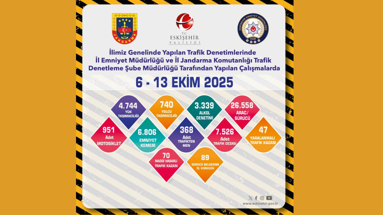 Eskişehir’de İl Emniyet Müdürlüğü ve İl Jandarma Komutanlığına bağlı ekipler, halkın huzuru ve güvenliği için denetimlerini aralıksız sürdürüyor. 6 - 13 Ekim tarihleri arasında il genelinde gerçekleştirilen denetimlerde, trafik güvenliğini sağlama amacıyla kapsamlı kontroller yapıldı.