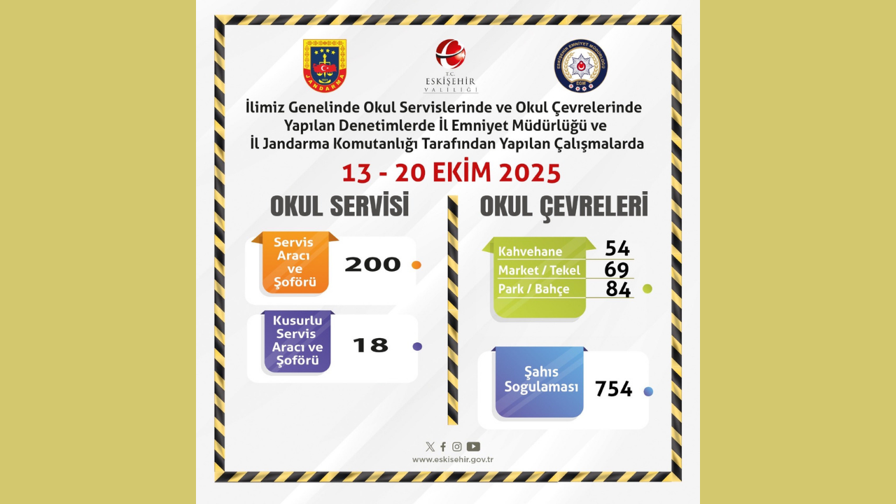 Söz konusu tarihler arasında 200 servis aracı ve şoförü denetlendi. 18 kusurlu servis aracı ve şoförü tespit edildi. Okul çevrelerinde bulunan; 54 kahvehane, 69 market ve tekel, 84 park ve bahçe denetlendi. Toplam 754 şahıs sorgulaması yapıldı.