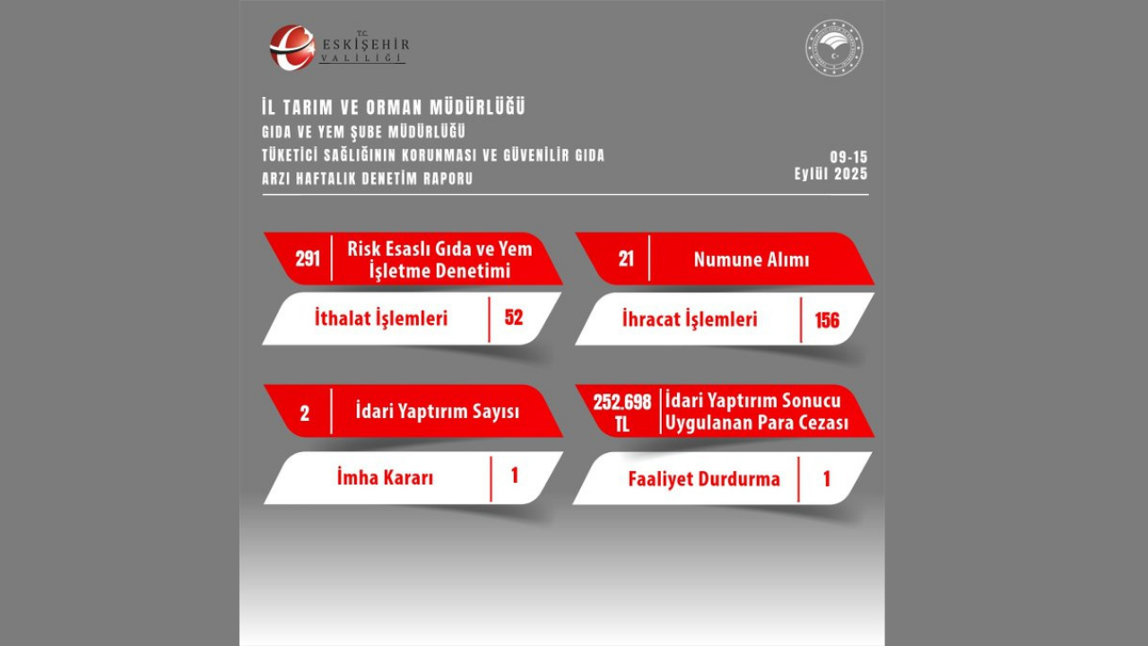 Rapora göre, geçen hafta boyunca toplam 291 risk esaslı gıda ve yem işletmesi denetlendi. Ayrıca, 52 ithalat işlemi gerçekleştirilirken, 21 numune alınarak laboratuvar incelemelerine gönderildi.