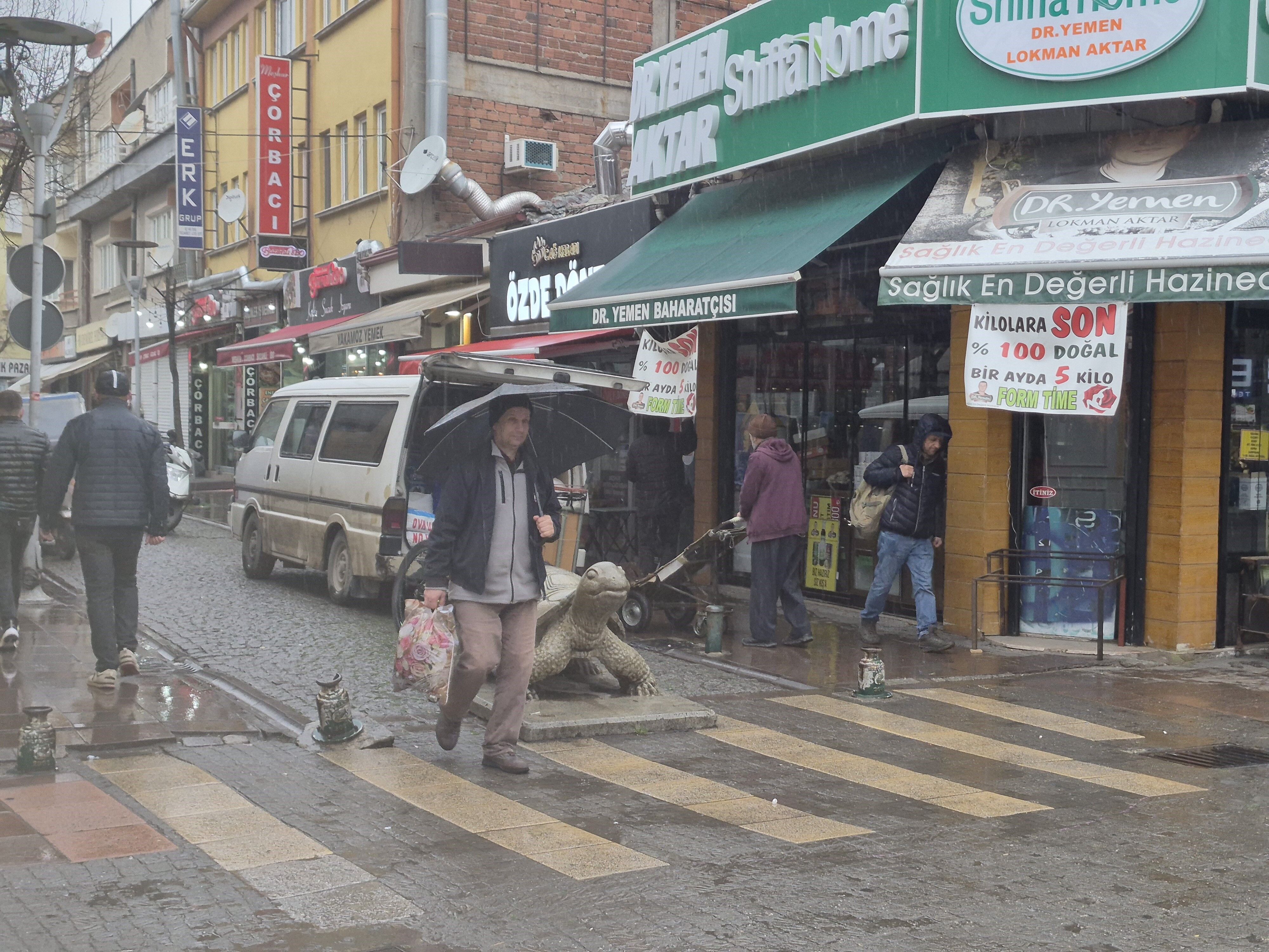 Yağışa hazırlıksız yakalanan vatandaşlar, bina saçakları ve iş yeri tenteleri altına sığınarak korunmaya çalıştı. Şehrin farklı noktalarında oluşan bu görüntüler, sağanağın etkisini gözler önüne serdi.