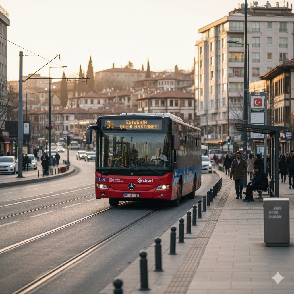 Görsel 1 (Öneri): Eskişehir'in Modern Kırmızı ve Mavi Belediye Otobüslerinin Şehir Merkezindeki Duraklarda Bekleme Anı.
