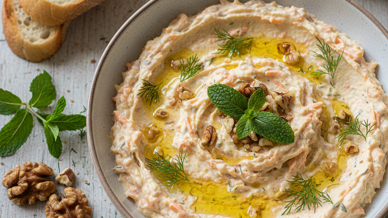 4. Yoğurtlu Karışımın Hazırlanması: Bir kasede süzme yoğurdu, ezilmiş sarımsakları ve tuzu pürüzsüz bir kıvam alana kadar çırpın. İçerisine ince kıyılmış cevizleri ekleyin.