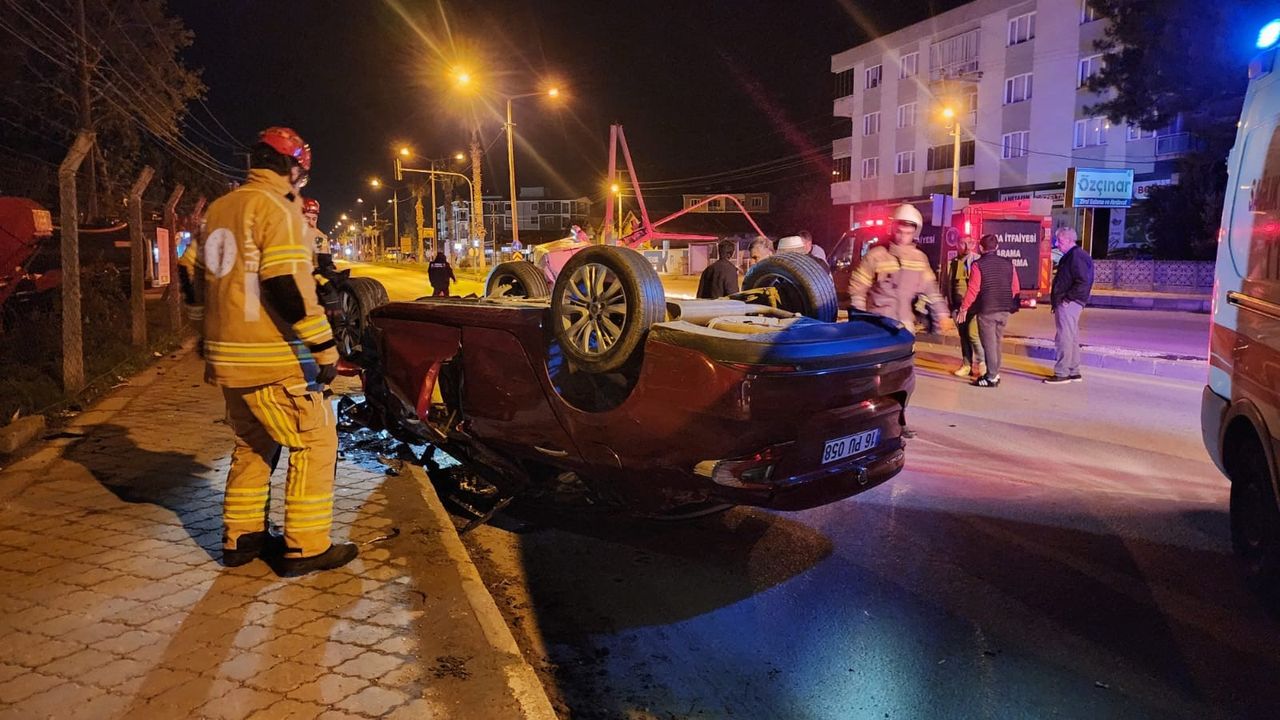 Olay, Bursa'nın Mustafakemalpaşa ilçesinde meydana geldi. Edinilen bilgiye göre, ilçe merkezi istikametine seyir halindeki otomobil sürücüsü hızı sebebiyle direksiyon hakimiyetini kaybetti. Aynı istikametteki kamyonete çarpmasıyla ortalık savaş alanına döndü. Otomobil takla atıp sürüklenirken, kamyonetin savrulmayla çarptığı trafik ışığı da yola devrildi. Otomobilde sıkışan iki kişi, olay yerine sevk edilen itfaiye ekiplerinin çalışmasıyla araçtan çıkarıldı. Yaralılar sağlık ekiplerince hastaneye kaldırılırken, yaralılardan birinin durumunun ağır olduğu öğrenildi. Polis ekipleri kazayla ilgili inceleme başlatırken, olay anı çevrede bulunan bir güvenlik kamerasına da yansıdı.