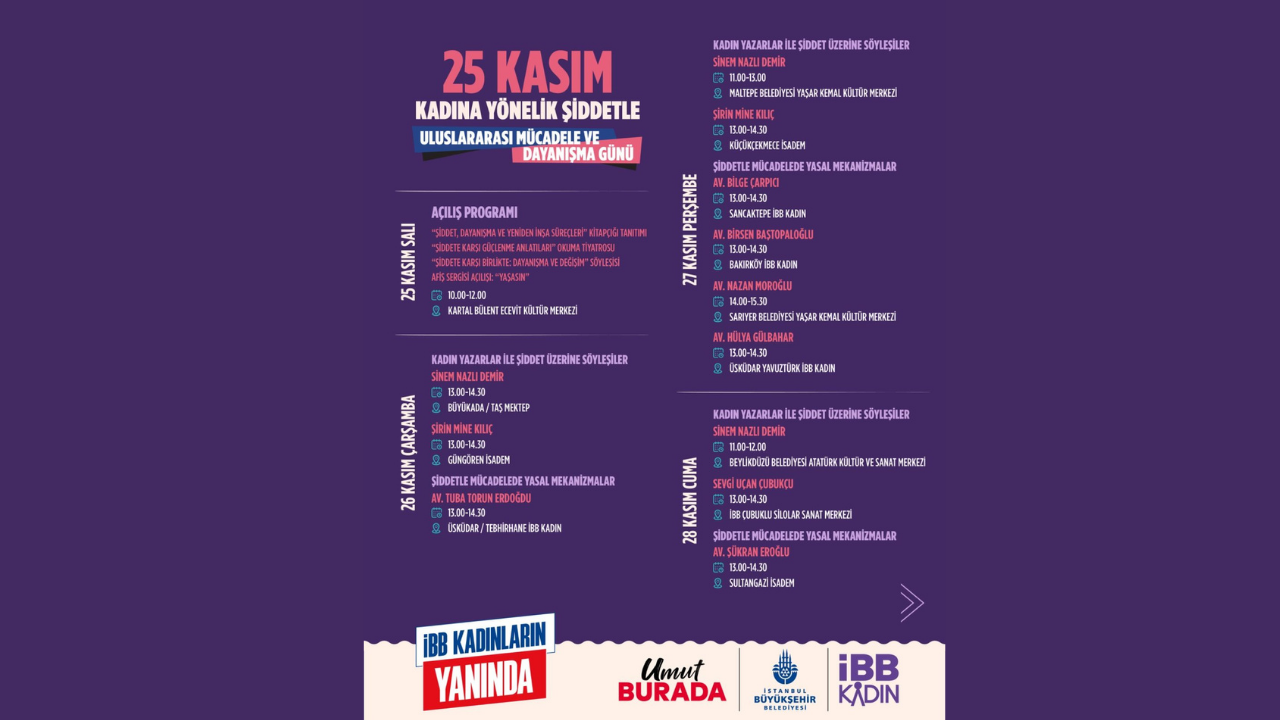 25 Kasım-10 Aralık tarihlerinde gerçekleştirilecek etkinlik programlarına İBB Kadın sosyal medya hesaplarından ve görsellerden ulaşabilirsiniz.