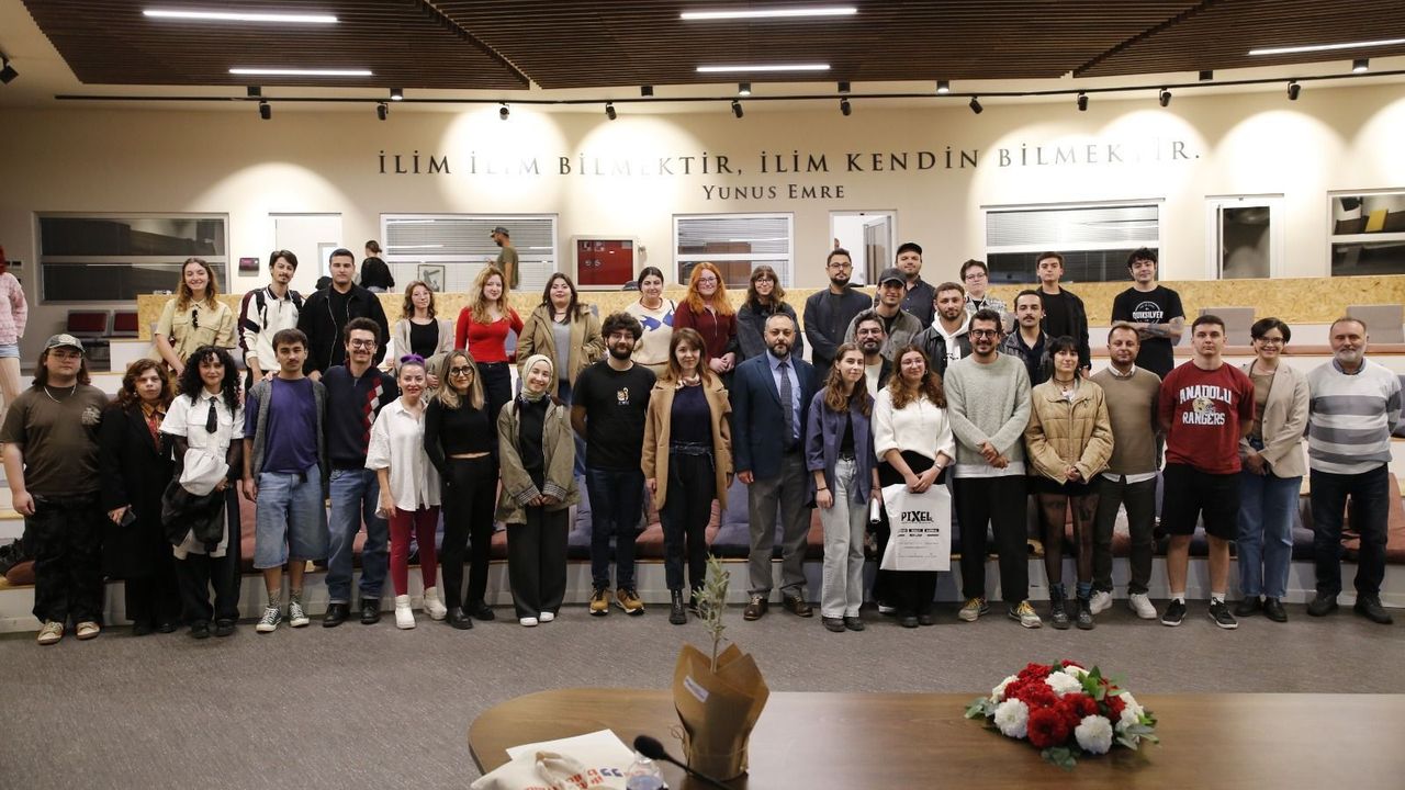 Kendi üretim sürecinden ve çalışma prensiplerinden bahseden grafik tasarımcı ve illüstratör Ethem Onur Bilgiç, yapay zekâ ile olan ilişkisini şöyle anlattı: “Animasyonların hazırlık aşamasını kendim yapıp yapay zekâdan destek almamaya çalışıyorum; çünkü kendi tarzımın dışına çıkmak istemiyorum. Fakat prompt kullanarak animasyonu hareketlendirme aşamasında bazen yapay zekâdan yararlanıyorum. Bu işin en başında sevdiğiniz şeyin peşinden gitmek gerek. Ben hep sevdiğim işi yapmaya çalıştım. Okurken çizimler yaptım, çizimler yaparken animasyonlar ürettim ve yarışmalara katıldım. ‘Şu kariyer yolunda ilerleyeceğim’ demeden, kendime sınır koymadan çalıştım.” Öğrencilerin yoğun ilgi gösterdiği söyleşinin sonunda, Karaçelik ve Bilgiç öğrencilerden gelen soruları yanıtlayarak; oyun geliştirme, sinema ve kodlama bilgisiyle yapay zekânın daha etkili kullanılabileceğine dair önerilerde bulundu. Etkinlik, konuşmacılara Prof. Dr. Barış Kılınç tarafından teşekkür belgelerinin takdim edilmesiyle sona erdi.