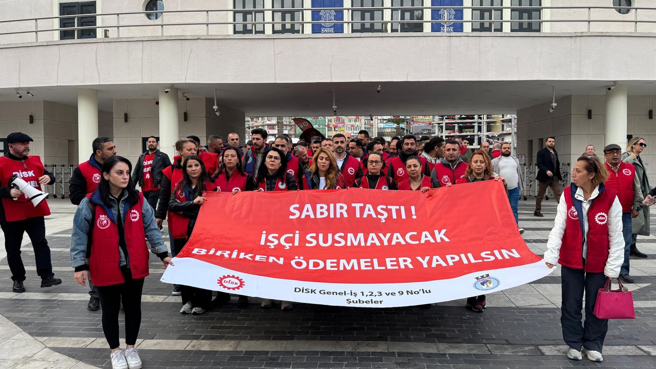 İzmir Büyükşehir Belediyesi'ne bağlı İZENERJİ, İZELMAN ve İZFAŞ şirketlerinde çalışan işçiler, üç aydır ödenmeyen sosyal haklarını protesto etmek için Kültürpark 9 Eylül kapısından belediye önüne yürüdü. Kalabalık grup, Büyükşehir Belediyesi'nin önünde basın açıklamasının ardından oturma eyleminde bulundu.