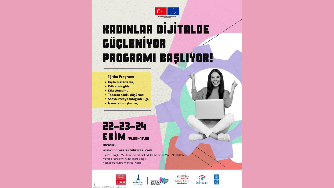 İzmirli genç kadınlar, İzmir Büyükşehir Belediyesi ile dijital dünyanın kapılarını aralayacak. Meslek Fabrikası Şube Müdürlüğü Dijital Gençlik Merkezi'nde düzenlenecek "Kadınlar Dijitalde Güçleniyor Programı", Avrupa Birliği finansmanı ile Birleşmiş Milletler Kalkınma Programı (UNDP) tarafından Türkiye Belediyeler Birliği (TBB) ile iş birliği içerisinde yürütülen Bugünün Gençleri Geleceğin Meslekleri Projesi kapsamında yapılıyor. 16-35 yaş arası genç kadınlara özel bu 3 günlük ilham dolu yolculuğa katılanlar, fikirlerini hayata geçirmeyi, dijital dünyada fark yaratmayı ve yaratıcılığını güçlendirmeyi öğrenecek. E-ticaretten dijital pazarlamaya, tasarım odaklı düşünmeden iş modeli oluşturmaya kadar dopdolu bir programa başvuru yapmak isteyenler https://www.ibbmeslekfabrikasi.com/tr/Kayitol/57 adresine girerek başvuruda bulunabiliyor.