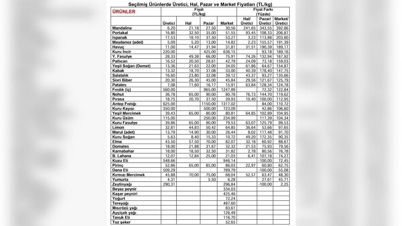 Kasım ayında üretici ve market arasındaki fiyat farkı en fazla yüzde 392,86 ile mandalinada görüldüğü belirtilirken, mandalinadaki fiyat farkını yüzde 206,87 ile portakal, yüzde 203,80 ile ıspanak, yüzde 191,39 ile maydanoz ve yüzde 189,17 ile havuç takip etti. Mandalina 4,9 kat, portakal 3,1 kat, ıspanak 3 kat, maydanoz, havuç ve kuru incir 2,9 kat fazlaya satıldı. Üreticide 6 lira 20 kuruş olan mandalina 30 lira 56 kuruşa, 16 lira 80 kuruş olan portakal 51 lira 55 kuruşa, 17 lira 53 kuruş olan ıspanak 53 lira 27 kuruşa, 5 lira 9 kuruş olan maydanoz 14 lira 82 kuruşa, 11 lira olan havuç 31 lira 81 kuruşa markette satıldı. Kasım ayında fiyatı en fazla artan ürün markette pırasa, üreticide ise patates olurken, fiyatı en fazla düşen ürün markette marul, üreticide portakal olduğu açıklandı.