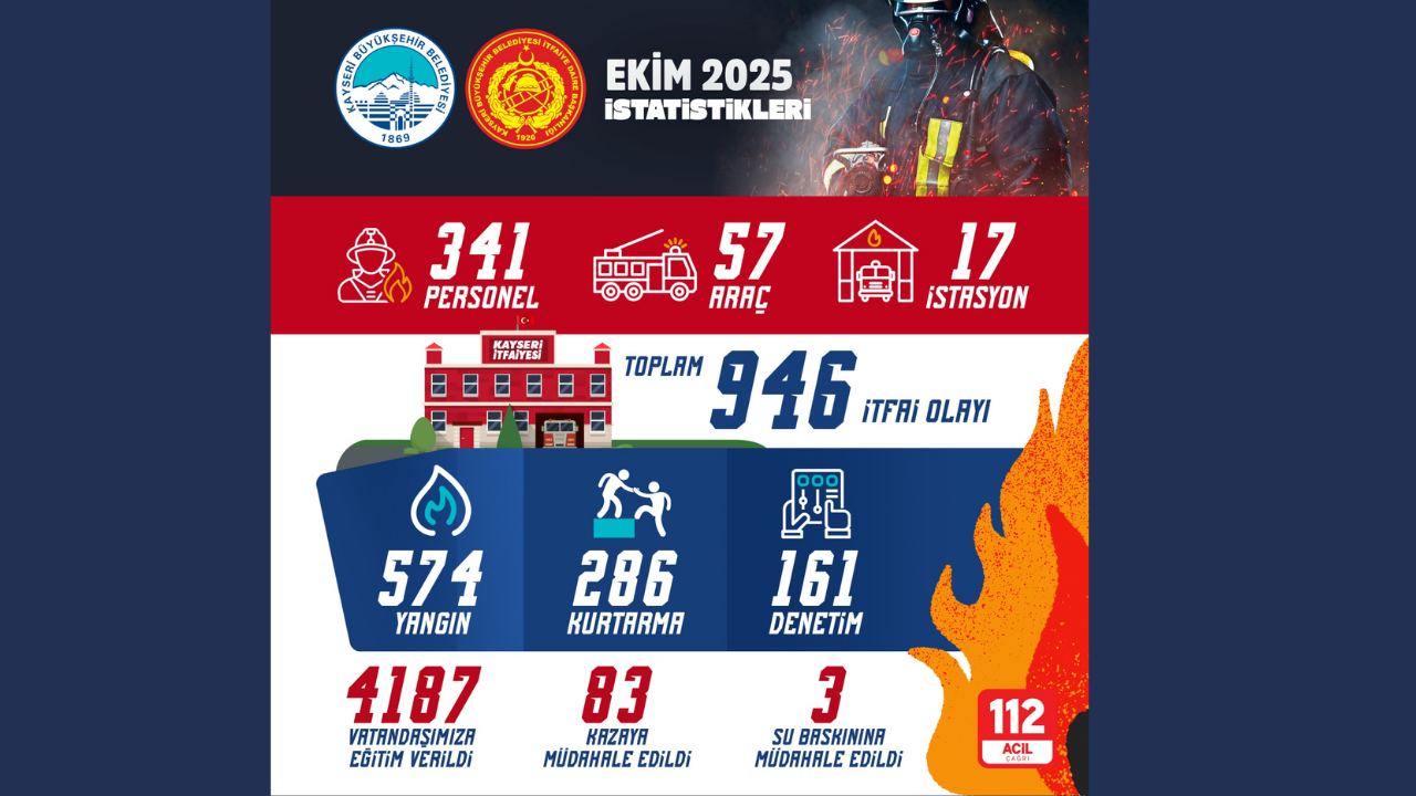 Kayseri Büyükşehir Belediyesi’nin 17 istasyon, 57 araç ve 341 personelden oluşan itfaiye teşkilatı, Ekim ayı boyunca 574 yangın, 286 kurtarma, 83 trafik kazası ve 3 su baskınına başarılı bir şekilde müdahale ederek toplamda 946 itfai olayda hızlı ve etkin bir şekilde görev yaptı.
