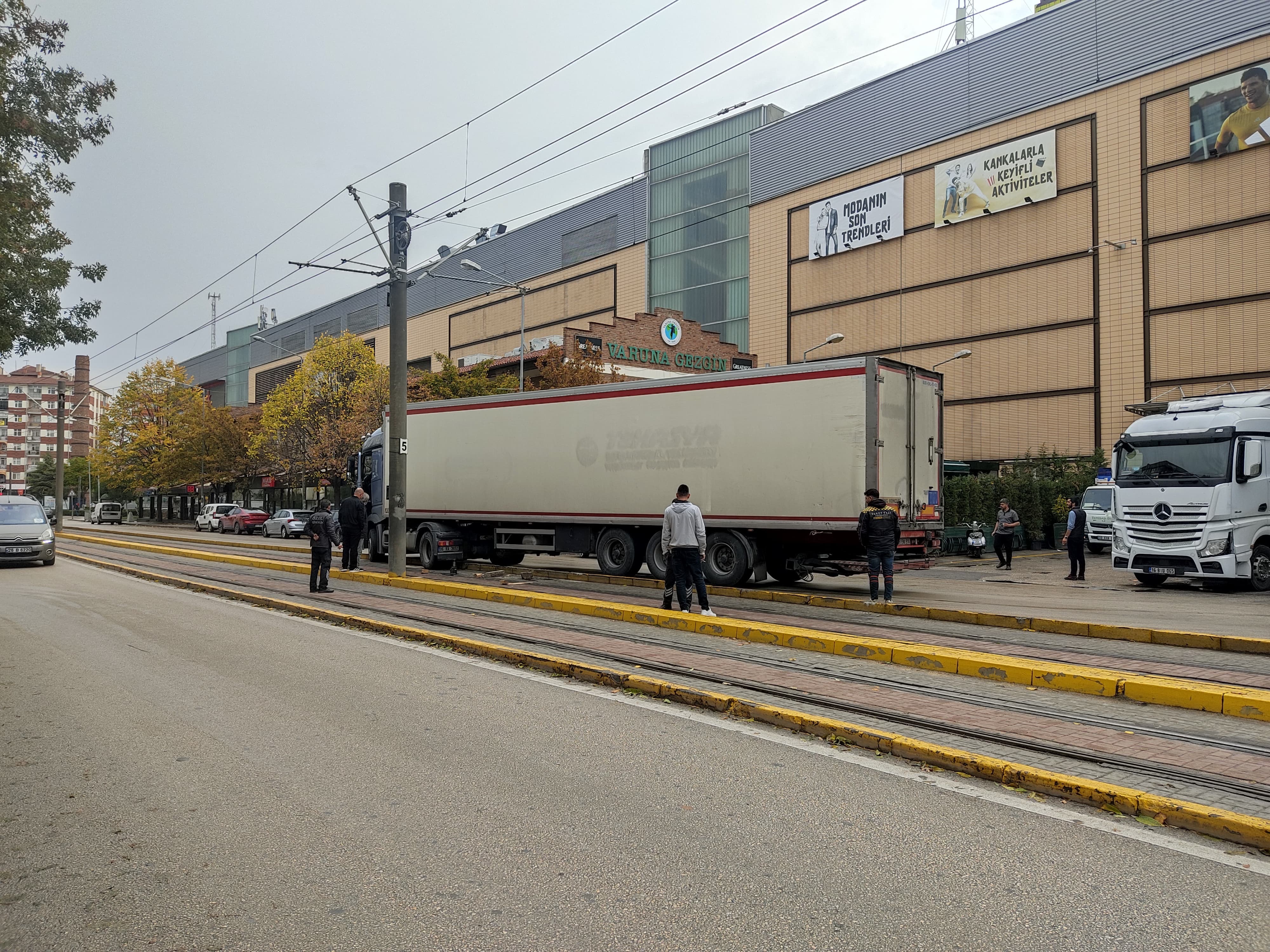 Olay, saat 09.00 sıralarında Fabrikacılar Caddesi üzerinde meydana geldi. Edinilen bilgilere göre; 06 KA 3652 plakalı tır, sürücüsünün direksiyon hakimiyetini kaybetmesi sonucunda tramvay yoluna girdi. Rayların kenarındaki taşlara takılan tır sebebiyle OTOGAR-SSK / OGÜ-SSK hatlarında tramvay seferleri yapılamazken, diğer karayolu araçları da ilerleyemedi. İhbar üzerine olay yerine polis ve ESTRAM ekipleri sevk edildi. Tırın bulunduğu yerden çekilmesi için çalışma başlatıldı. Ekiplerin gerekli müdahaleyi yapmasının ardından seferler normale döndü.