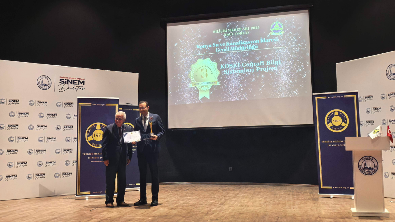 Bu kapsamda veri yönetimi kapasitesini artırması, saha süreçlerini dijitalleştirmesi ve akıllı şehir uygulamalarına sağladığı güçlü katkılar sebebiyle KoskiCBS, Türkiye Bilişim Derneği tarafından düzenlenen 12. Bilişim Yıldızları 2025 Yerli ve Milli/Özgün Proje Yarışması’nda ödüle layık görüldü. İstanbul’da düzenlenen törende kurum adına ödülü, KOSKİ Genel Müdür Yardımcısı Yusuf Demet aldı.