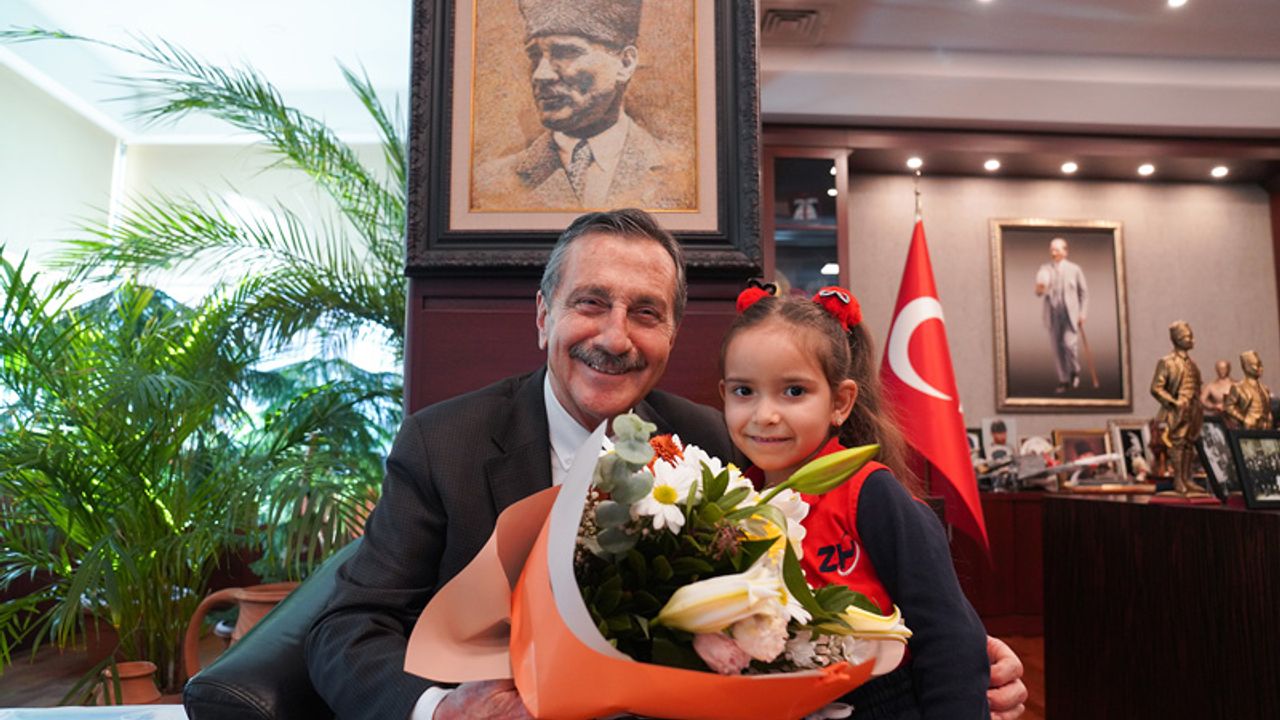 kartında yer alan mesajı Başkan Ataç’a heyecanla okurken, kendisi için getirdiği çiçeği