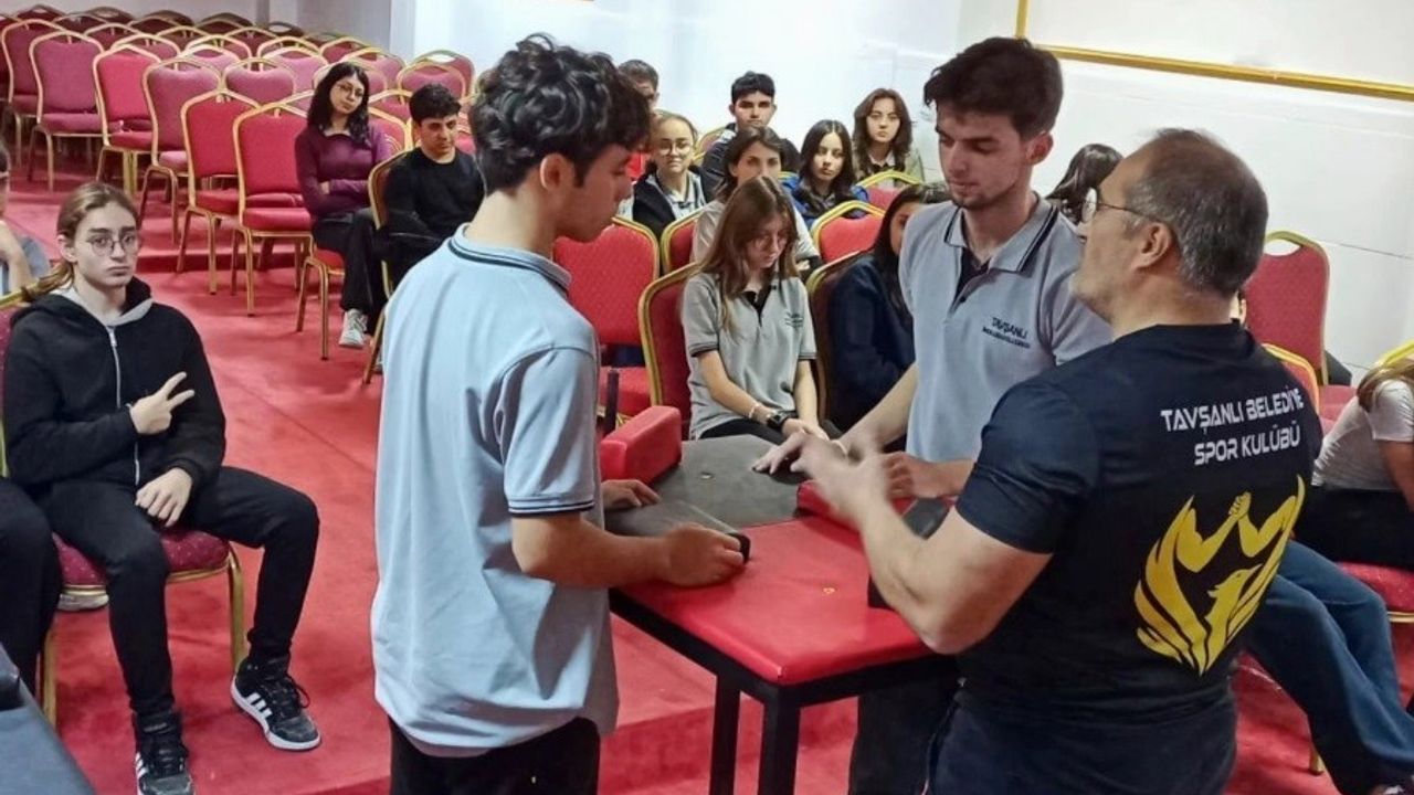 Kütahya'nın Tavşanlı ilçesinde gençleri spora teşvik etmeyi sürdüren Tavşanlı Belediye Spor Kulübü, bilek güreşi branşının inceliklerini liseli gençlere anlattı.