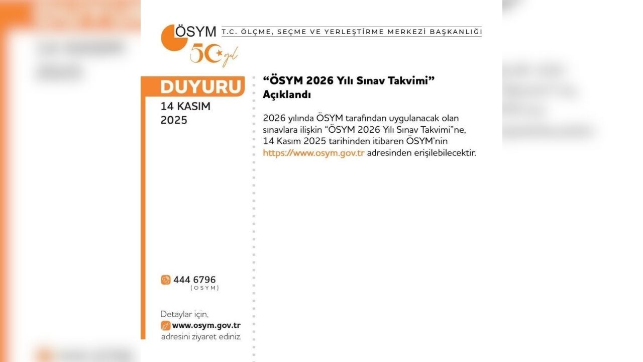 "Kıymetli adaylar, 2026 ÖSYM Sınav Takvimi belli oldu. Yükseköğretim Kurumları Sınavı (YKS) 20-21 Haziran'da, Dikey Geçiş Sınavı (DGS) 19 Temmuz’da, Milli Savunma Üniversitesi Askeri Öğrenci Aday Belirleme Sınavı (MSÜ) 1 Mart’ta gerçekleştirilecek. Kamu Personeli Seçme Sınavı (KPSS) Lisans Genel Yetenek-Genel Kültür uygulaması 6 Eylül’de, KPSS Alan Bilgisi uygulamaları 12-13 Eylül’de, KPSS Ortaöğretim ise 25 Ekim’de, Milli Eğitim Bakanlığı Akademi Giriş Sınavı (MEB-AGS) 12 Temmuz’da uygulanacak. 2026 Sınav Takvimine ÖSYM kurumsal web sayfası üzerinden ulaşabilirsiniz. Sınav uygulamalarına katılacak tüm adaylarımıza başarılar dilerim."