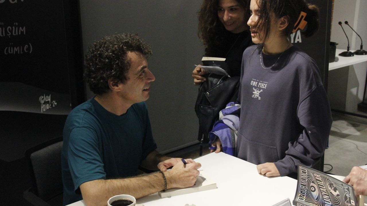 Söyleşinin sonunda katılımcıların sorularını da yanıtlayan Özgür Mumcu’ya, Nilüfer Belediye Başkanı Şadi Özdemir’in eşi Nuray Özdemir günün anısına hediye verdi. Mumcu, etkinliğin sonunda son romanı “Dünyalılar”ı okurları için imzaladı.