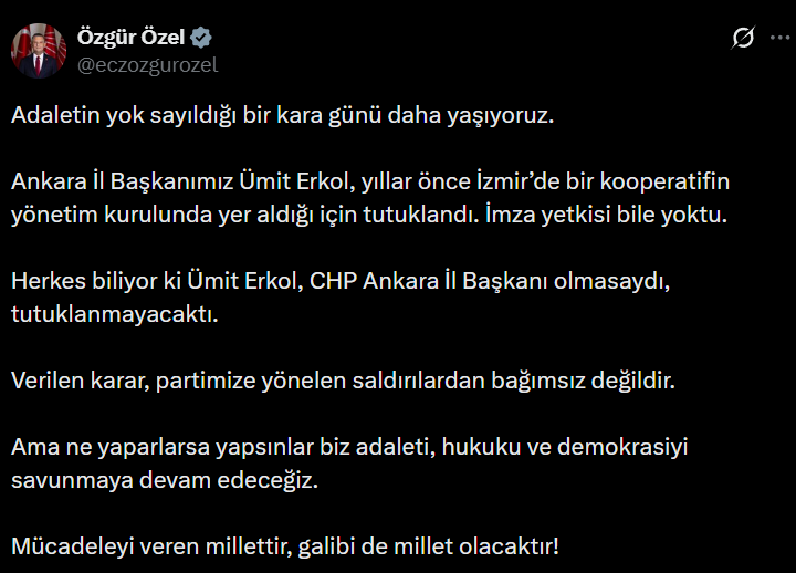 Cumhuriyet Halk Partisi (CHP) Genel Başkanı Özgür Özel, Ankara İl Başkanı Ümit Erkol’un tutuklanmasıyla sarsılan siyaset gündemine ilişkin sosyal medya üzerinden çok sert bir açıklama yayımladı. Erkol’un tutuklanma sürecini “adaletin yok sayıldığı bir gün” olarak tanımlayan Özel, yargı kararının doğrudan partilerini hedef aldığını savundu.
