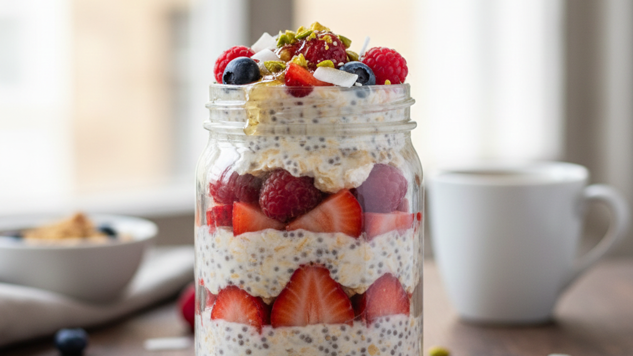 4. Son Dokunuş ve Servis: Sabah kavanozu buzdolabından çıkardığınızda üzerine taze çilek, yaban mersini veya fındık gibi çıtır malzemeleri ekleyin. Taze meyveleri akşamdan eklemek meyvelerin sulanmasına neden olabileceği için servis anında eklemek daha taze bir sonuç verir.
