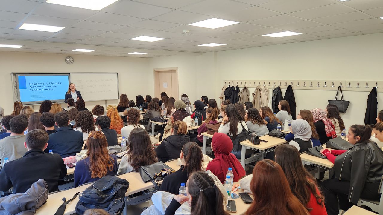 Prof. Dr. Dikmen etkinlikte Beslenme ve Diyetetik Bölümü birinci ve ikinci sınıf öğrencilerine bu alandaki geçmişten günümüze olan değişimleri ve güncel trendleri aktardı. Konuşmasında özellikle nutrigenomik, mikrobiyota, fonksiyonel besinlerin yanı sıra artık yapay zekânın da ön plana çıktığından bahseden Dikmen, öğrencilere yapay zekâyı öğrenmek ve doğru kullanmak kadar yabancı dil konusunda da kendilerini geliştirmelerinin hâlâ önemli bir ihtiyaç olduğundan söz etti. Etkinlik soru-cevap kısmının ardından sona erdi.
