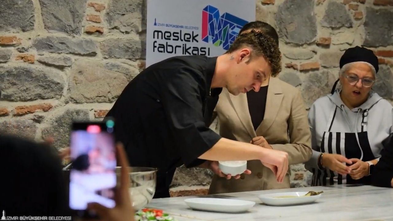 Şef Rıfat Yurttaş, İzmir Büyükşehir Belediyesi’nin pastacı çıraklığı kursundan mezun olan işitme engelli kursiyerlerle bir araya gelerek Ege mutfağına özgü meze ve zeytinyağlı yemekler yaptı. İşaret dili çevirmenleri aracılığıyla mezun kursiyerlerle iletişim kuran Yurttaş, yemek yapmanın inceliklerini aktardı.
