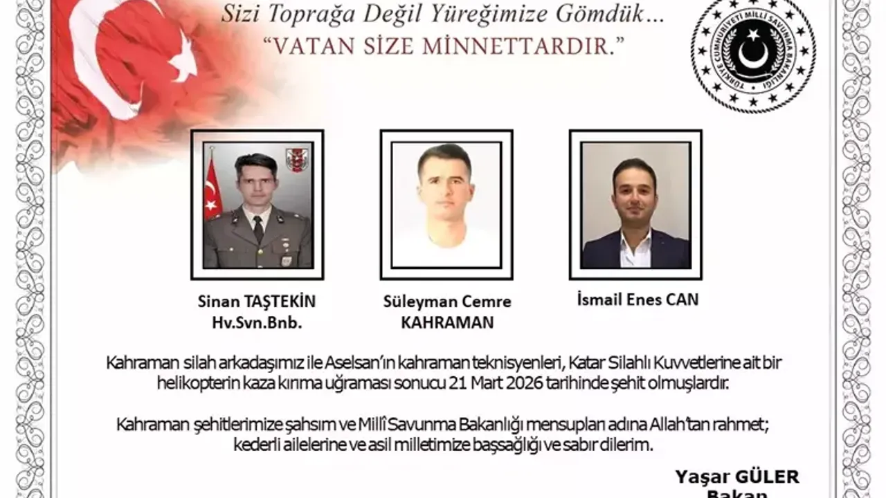 Katar’da meydana gelen helikopter kazasında şehit olan Türk personelin kimlikleri açıklandı. Milli Savunma Bakanlığı, elim kazada hayatını kaybeden isimlerin Hava Savunma Binbaşı Sinan Taştekin ile ASELSAN personelleri Süleyman Cemre Kahraman ve İsmail Enes Can olduğunu duyurdu.