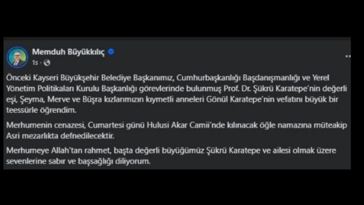 Başsağlığı mesajı yayımlayan Kayseri Büyükşehir Belediye Başkanı Memduh Büyükkılıç; "Önceki Kayseri Büyükşehir Belediye Başkanımız, Cumhurbaşkanlığı Başdanışmanlığı ve Yerel Yönetim Politikaları Kurulu Başkanlığı görevlerinde bulunmuş Prof. Dr. Şükrü Karatepe’nin değerli eşi, Şeyma, Merve ve Büşra kızlarımızın kıymetli anneleri Gönül Karatepe’nin vefatını büyük bir teessürle öğrendim. Merhumenin cenazesi, Cumartesi günü Hulusi Akar Camii’nde kılınacak öğle namazına müteakip Asri mezarlıkta defnedilecektir. Merhumeye Allah’tan rahmet, başta değerli büyüğümüz Şükrü Karatepe ve ailesi olmak üzere sevenlerine sabır ve başsağlığı diliyorum" ifadelerini kullandı.