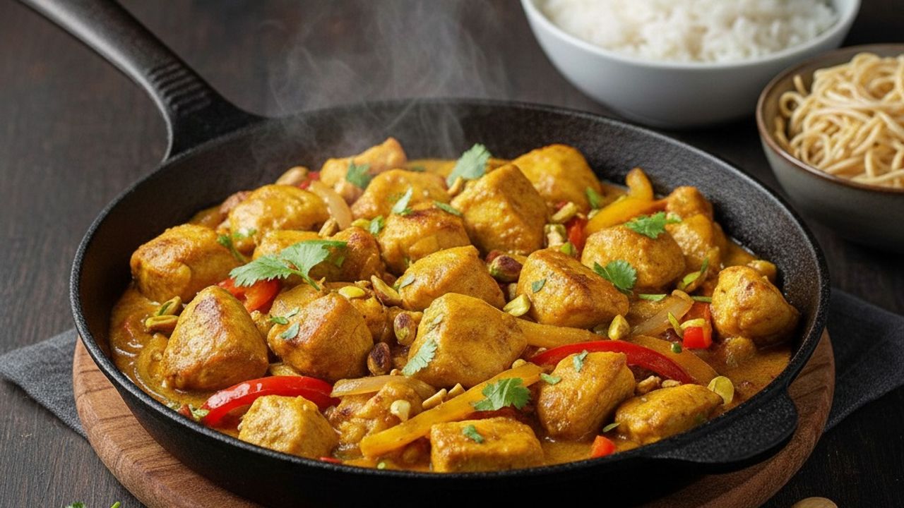 Baharatlama: Tavukları tekrar tavaya alın. Köri, pul biber, tuz ve karabiberi ekleyip iyice karıştırın.