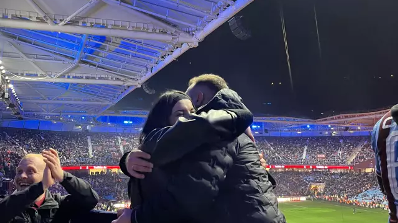 Trabzonspor ile Fenerbahçe arasında Papara Park’ta oynanan karşılaşma öncesinde tribünlerde romantik bir sürpriz gerçekleşti. Trabzonsporlu taraftar Emre Şeras, bordo-mavili taraftarların desteğini alarak kız arkadaşına evlilik teklifinde bulundu.