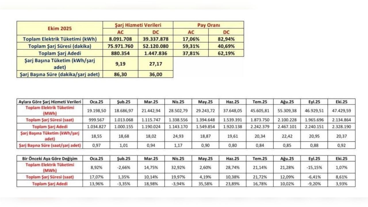 "Ekim ayı verilerine göre ülke genelinde 36 bin 361 adet şarj noktasında (soketinde) toplam 2 milyon 328 bin 190 adet şarj işlemi gerçekleştirilmiştir. Bu işlemler sonucunda 2 milyon 134 bin 864 saate karşılık gelen toplam şarj süresiyle birlikte 47 bin 429 megavat düzeyinde elektrik tüketimi gerçekleşmiştir. Gerçekleşen toplam elektrik tüketiminin yaklaşık yüzde 61'lik kısmı, kullandığı elektrik enerjisinin yüzde 100'ü yenilenebilir enerji kaynaklarından sağlandığı YEK-G (Yenilenebilir Enerji Kaynak Garanti) Belgesi ile belgelendirilen yeşil şarj istasyonlarında gerçekleştirilmiştir. Ekim 2025'te şarj istasyonlarında en yüksek elektrik tüketimi 14 bin 438 megavat ile İstanbul'da gerçekleşti. İstanbul'u Ankara, İzmir ve Bursa takip ederken, toplam tüketim içinde en yüksek payı da yüzde 30,25 ile İstanbul aldı. Markalar arasında en yüksek elektrik tüketimi 11 bin 292 megavat ile Trugo tarafından yapılırken, onu 8 bin 463 megavat ile Zes izledi. Eşarj, Astor ve Tesla ise tüketim sıralamasında ilk beş marka içinde yer aldı."