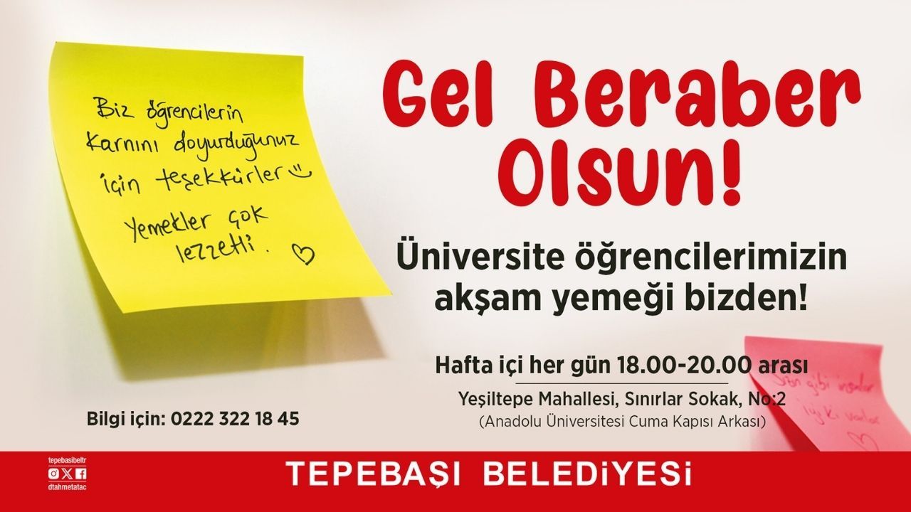 Tepebaşı Belediyesi’nin, kentteki üniversite öğrencileri için “Gel beraber olsun” sloganı ile başlattığı ücretsiz yemek hizmeti yeni dönemde de devam ediyor. Hafta içi her gün Anadolu Üniversitesi Cuma Kapısı arkasında bulunan Yeşiltepe Mahallesi Sınırlar Sokak No: 2 adresinde öğrencilere akşam yemeği ücretsiz olarak sunulmaya devam edecek. Nihal-İsmail Akçura Aşevi’nde uzman belediye personeli tarafından özenle pişirilen yemekler, 29 Eylül Pazartesi günü itibariyle öğrencilere 18.00-20.00 saatleri arasında ikram edilecek. Üniversite öğrencileri, öğrenci belgesi ibraz ederek sunulan yemek ikramından faydalanmaya devam edecek.