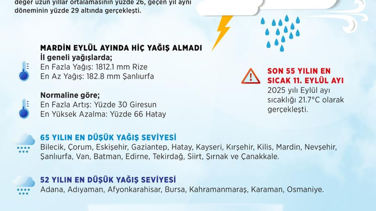 2025 yılı Eylül ayı bazındaki yağış değerlendirmelerine göre ise Türkiye geneli eylül ayı yağışı, normali ve geçen yıl eylül ayı yağışının altında gerçekleşti. Türkiye genelinde eylül ayında ortalama 21.4 mm yağış kaydedildi. Bu değer, uzun yıllar ortalamasının (24.9 mm) yüzde 14, geçen yıl eylül ayı yağışının (33.8 mm) yüzde 37 altında gerçekleşti. Mardin eylül ayında hiç yağış almadı. Mardin’de 65, Edirne, Kırklareli ve Tekirdağ’da son 21 yılın en düşük eylül ayı yağışları kaydedildi.