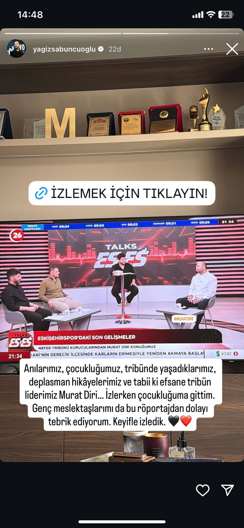 Sabuncuoğlu paylaşımında, “Anılarımız, çocukluğumuz, tribünde yaşadıklarımız, deplasman hikâyelerimiz ve efsane tribün liderimiz Murat Diri… İzlerken çocukluğuma gittim. Genç meslektaşlarımı bu röportajdan dolayı tebrik ediyorum. Keyifle izledik.” ifadelerine yer verdi.
